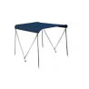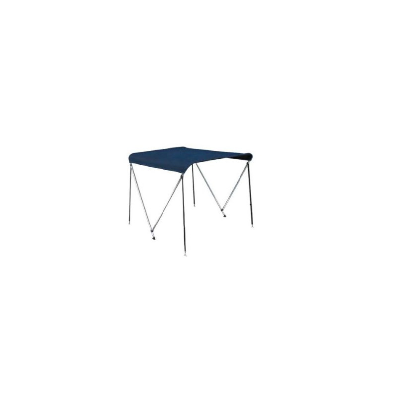 Bimini top in anodized aluminum. Connectors and mounts made from marine grade polymers. Polyester webbing straps and stainless steel fasteners. Blue polyester water resistant fabric.
